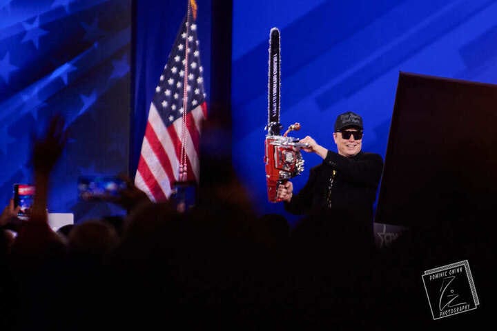 Conservative family values, everyone! But Musk had bigger priorities, which included flailing around with some kind of custom chrome chainsaw with “Long live freedom, Goddammit!” emblazoned in Spanish on it, a gift from that Argentinian President Javier Milei. Also clanking his gold chain on the mic, lying about Democrats importing illegal immigrants to vote for them, and generally blathering hallucinatory nonsense like: “when you add caring and competence where it was absent before, you can actually save billions of dollars, sometimes just in an hour.”