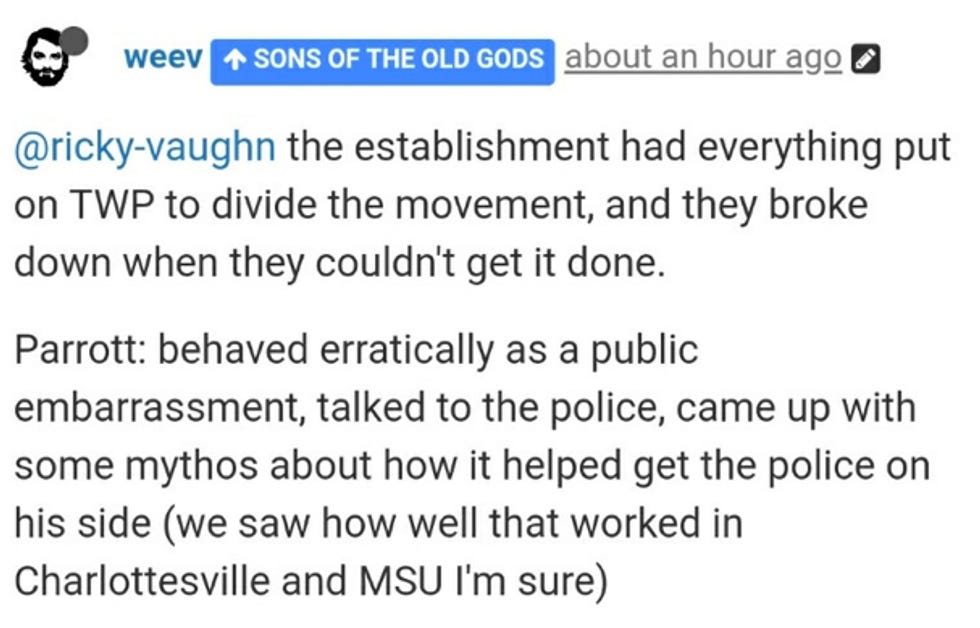 As for me standing up for Parrott, I stood up for the TWP when Antifa attacked them. That was the ONLY honorable thing to do, and anyone who did otherwise is an enemy of our race! I have had nothing positive to say, about the leftist economics rattled off by Heimbach, and I certainly haven’t expressed support for the sexual degeneracy and disloyalty that went on in their homes.