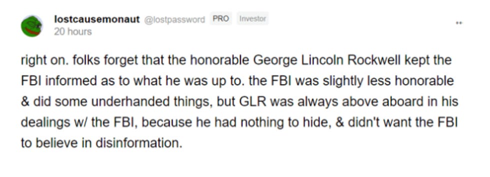 And in a followup post, he explains that it shouldn't matter whether or not he talks to the Feds, because the alt-right is not criminal!