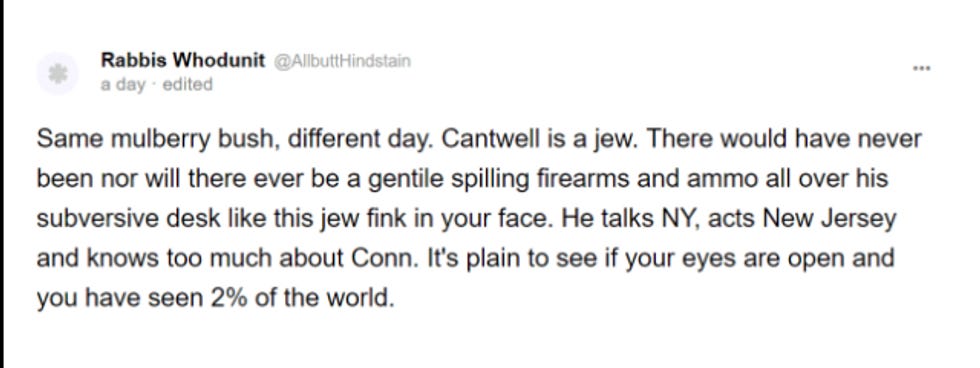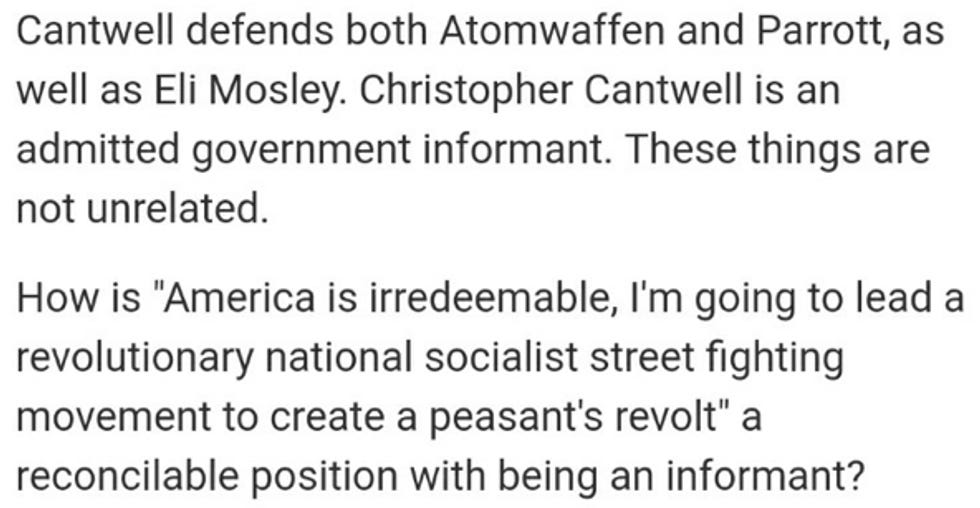 But most of his venom was reserved for his former friend Christopher "Crying Nazi" Cantwell, because of how Cantwell has been talking to the fuzz as he awaits trial for having teargassed protesters at the Unite The Right rally in Charlottesville.