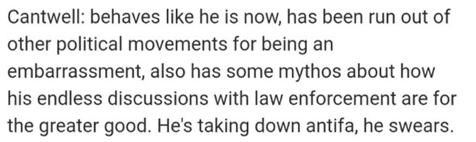 Cantwell then explains that he is talking to the Feds so he can tell them all about how Antifa are the REAL criminals.