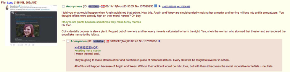 Those over in 4chan's /pol/ are unhappy with the actions Anglin and weev have taken with regards to Heyer's death, but only because they are mad that it is going to make her into a martyr and make people like the Left better than them. Not because it is an abhorrent thing to do.