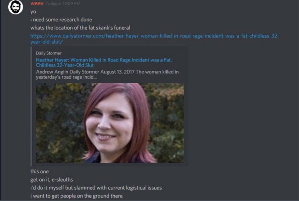 And now, the Nazis of Stormfront want their revenge. In a post in The Daily Stormer's secret chatroom yesterday (which has since been shut down), the systems administrator for the site -- Andrew Alan Escher Auernheimer, the neo-Nazi black hat hacker known as "weev" -- announced a plan to find out where Heather Heyer's funeral would be held, and to "get people on the ground" there.