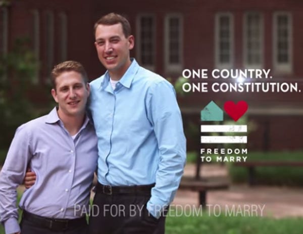 “I’m a Republican, I’m a doctor, and I’m a soldier,” says a voice over by [Jesse] Ehrenfeld as the commercial shows images of him serving in uniform, and back at home with his boyfriend, Judd Taback. “As a military physician, I take care of other people’s loved ones who are wounded in combat. But here at home, I’m fighting a different fight. Because I’m gay, I’m not allowed to marry my partner here in Tennessee where we live.”