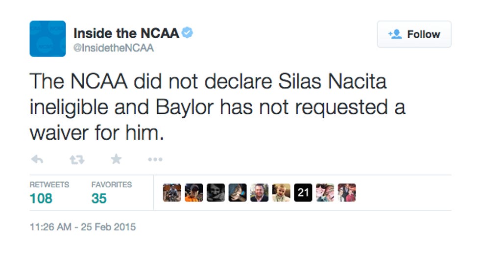 So, obviously, the NCAA had to take action against Nacita, lest his hifalutin, floor-sleepin' ways cheapen the NCAA's sacred vows of amateurism. Baylor fan site Our Daily Bears points out that if Nacita had been a regular student, Baylor and the NCAA literally wouldn't have cared where he was sleeping. But since he is a foo'baw player where he sleeps matters, though it doesn't matter enough to actually provide Nacita with housing — that's a privilege reserved for scholarship players only.