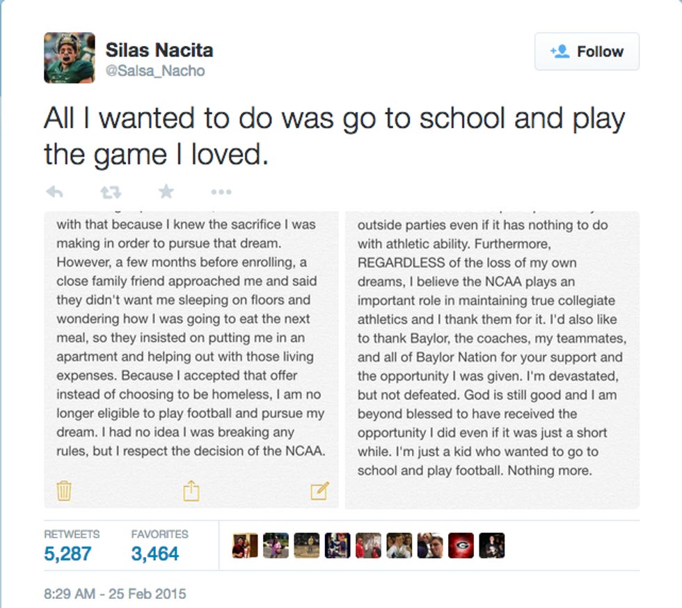 According to Nacita, a family friend offered to help the homeless Baylor hopeful out with housing and living expenses so he could pursue his dream of being a Baylor football player. However, accepting the help constitutes an NCAA infraction.