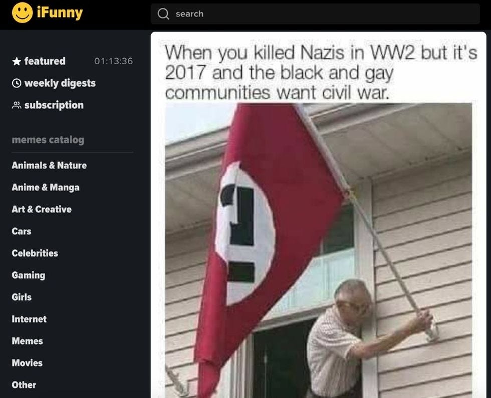 And as Buzzfeed News has reported, iFunny has become a real draw for white nationalists, because there's just something about the brilliance of stupid goddamn memes that resonates with people amenable to believing Jews and shadowy liberal conspiracies are the reason their lives suck.
