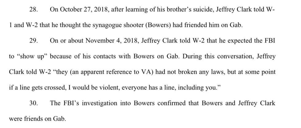 As it turns out, both Jeffrey Clark and his brother Edward William "Teddy" Clark had previously interacted with Robert Bowers, the Pittsburgh shooter, on Gab, and FBI documents show they may have been planning a similar attack for the same day. However, after the news hit of the Pittsburgh shooting and it became clear that the FBI was going to be taking a hard look at Bowers's activity on Gab, Teddy Clark committed suicide with one of their many guns. Family members told police that Jeffrey Clark had ramped up his rabid anti-Semitism after his brother's death.