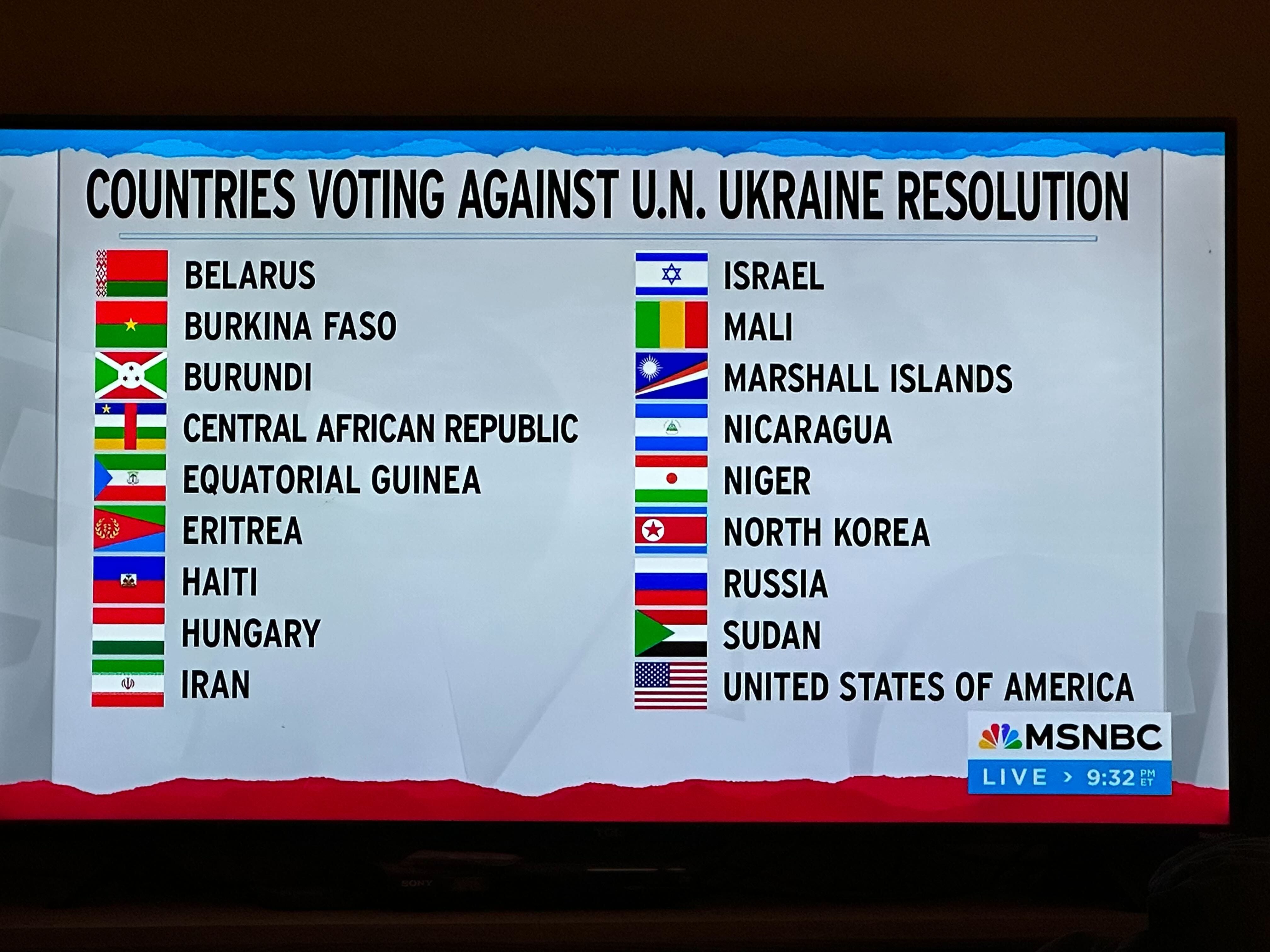 We were one of only 18 countries total who voted against that resolution. Rachel Maddow’s team helpfully made this graphic to illustrate what kind of cool kids table we’re sitting at now: