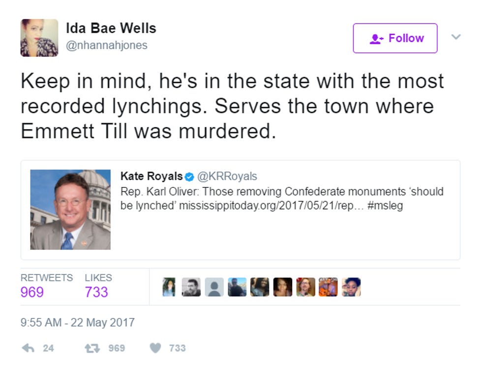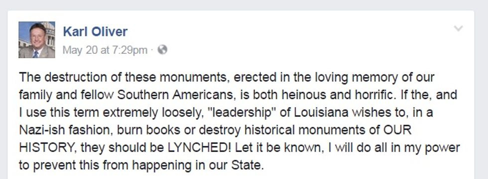 If Landrieu stomping on those Confederate assholes' faces isn't enough to make you happy, read this story about a bumfuck yokel Mississippi state representative named Karl Oliver, who is VERY UPSET that New Orleans has pulled a "Nazi" by removing these monuments, and says everybody who did this should be "LYNCHED!"
