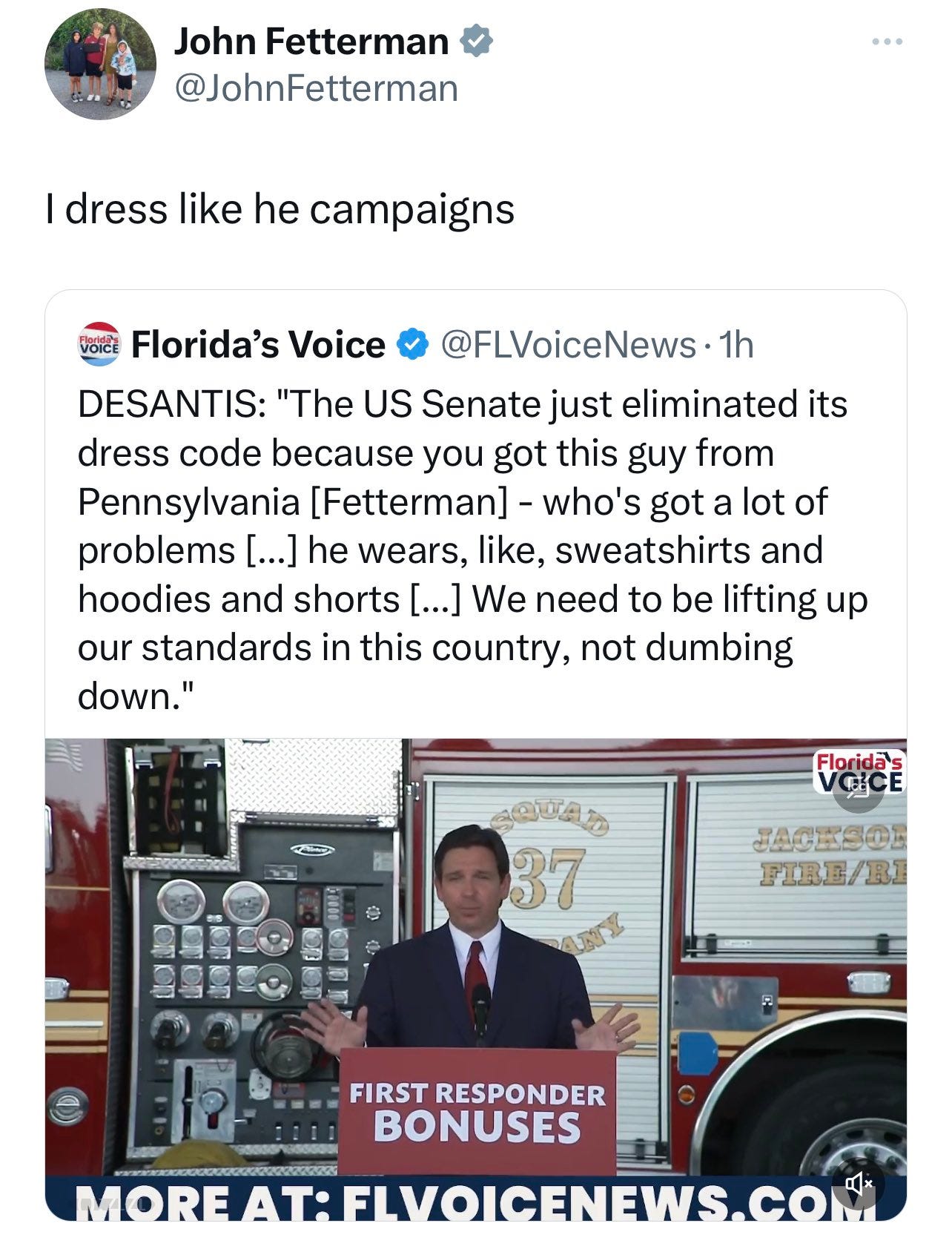 But John Fetterman did not quit. He arose from his hospital bed. He put on his shorts and his hoodie. He then took one step to the door. Then another step. And another and another. The nurses and his people rushed forward to assist him and he shook their hands away from his shoulders. He refused the wheel chair. His wife told everyone to stand away. She whispered encouragement to him as he kept taking those steps.
