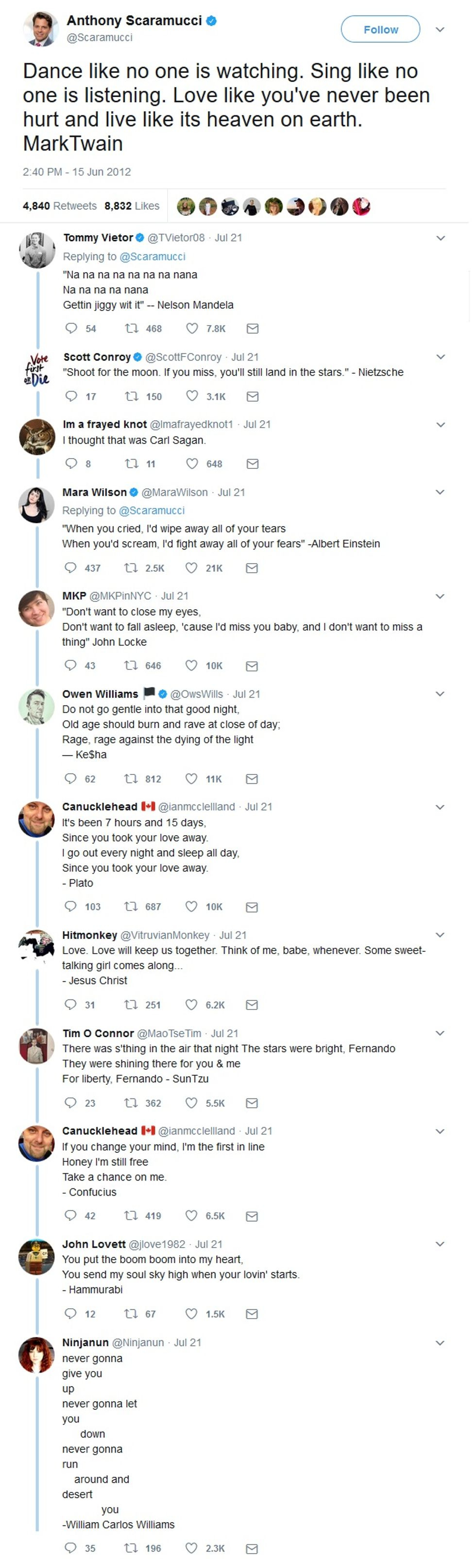 Also, we would like to bring to your attention this additional evidence, from 2012, that Anthony Scaramucci is either A Idiot or a troll. We've included a few choice replies, too:
