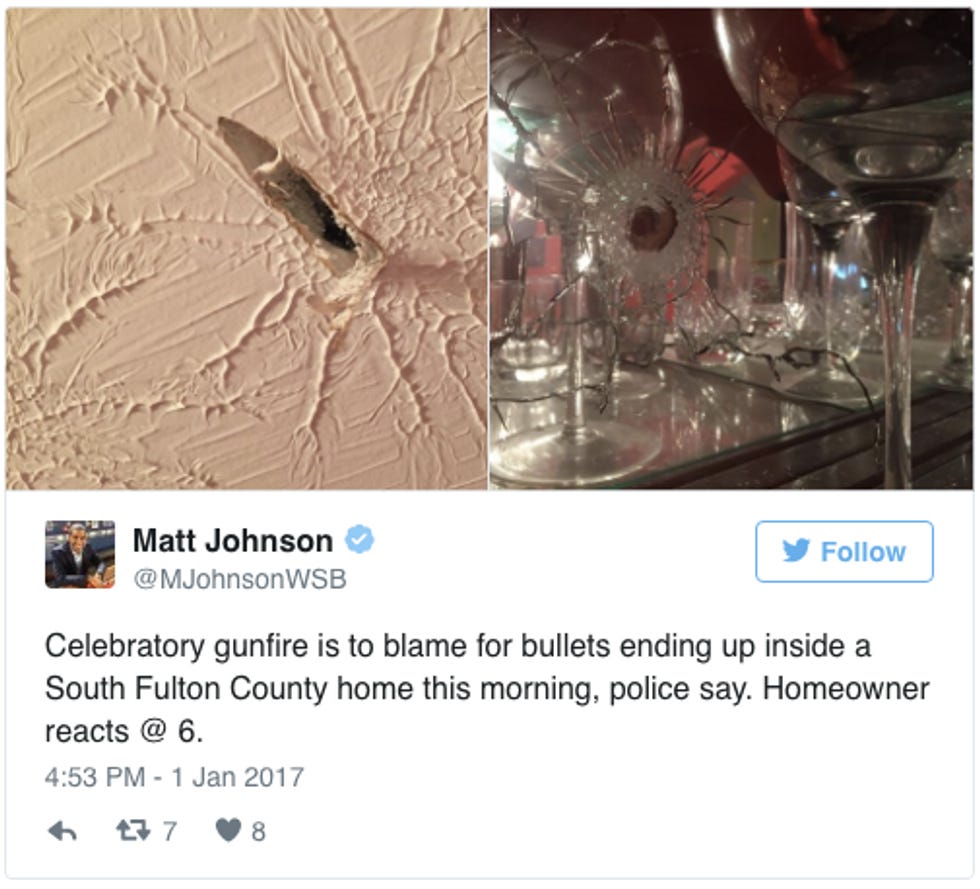 In Georgia, one woman's home was showered with bullets from celebratory gunfire. Luckily, none of the four people who live there were struck by the bullets, but had they been standing near her china cabinet, it could have been a different story.