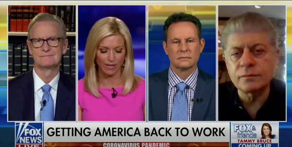 The "Fox & Friends" crew championed Marcus's irresponsible and whiny op-ed Thursday morning from the safety of their homes. Guest Andrew Napolitano, a law professor and former judge, declared it was "time for all of us to come back to our normal society."