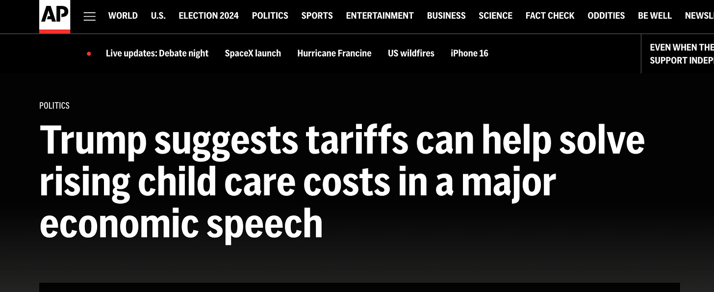 But apparently nobody in the New York Times campaign coverage newsroom knows that. And it matters, because this is a lie Donald Trump has long been telling, one he’s particularly obsessed with right now. He’s out there calling himself a tariffs man, saying he’s going to be a tariffs president, and in an article that’s ostensibly about voters’ concerns over Trump’s age, incoherence, babbling, and lying, they didn’t bother to note that the one central conclusion of their sanewashing of Trump’s quote about (theoretically) childcare was based on Trump’s longstanding lie that tariffs are taxes on foreign countries.