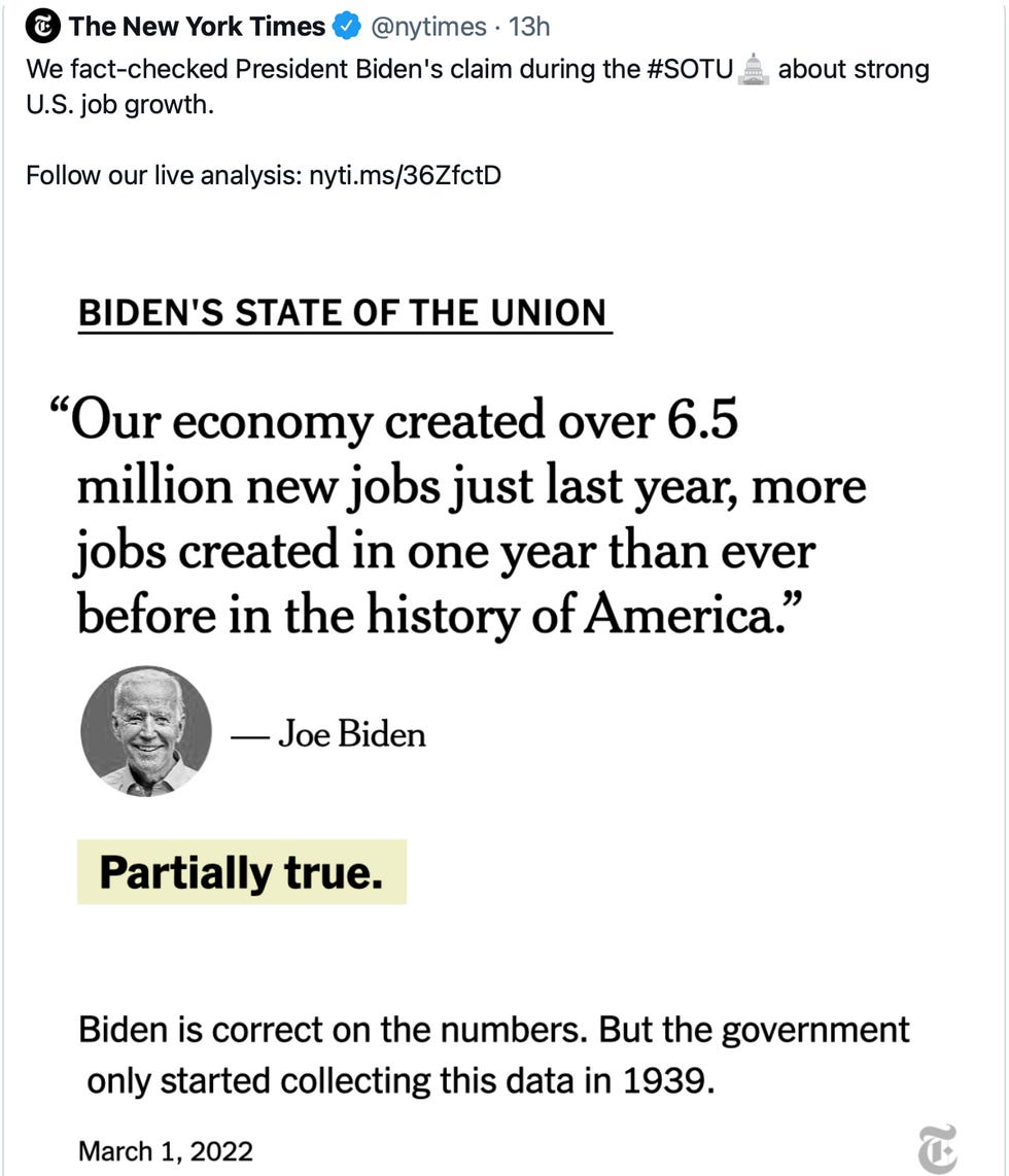 The Times conceded that “Biden is correct on the numbers” but — and they apparently thought this was important — “the government only started collecting this data in 1939.” If Biden had the integrity of your average Vulcan, he would’ve been more precise. The government began tracking job creation data three years before Biden was born, and it’s true that America has existed for significantly longer than Biden’s lifetime.