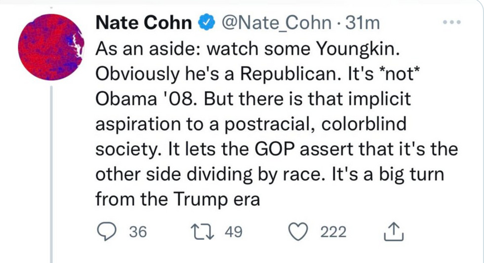 NYT's Nate Cohn Thinks Glenn Youngkin’s A Postracial Dreamboat Almost Like That Obama Guy