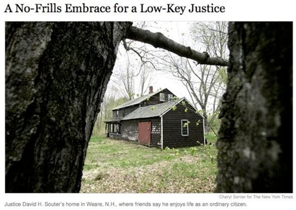 Just imagine our very private and humble Supreme Court justice sitting in his secluded shack in the woods, looking out the window, only to find some nut lurking behind two trees with a macro zoom lens. Next, theNYTwill boil his bunny and put him down a well, for fattening purposes. [ New York Times ]
