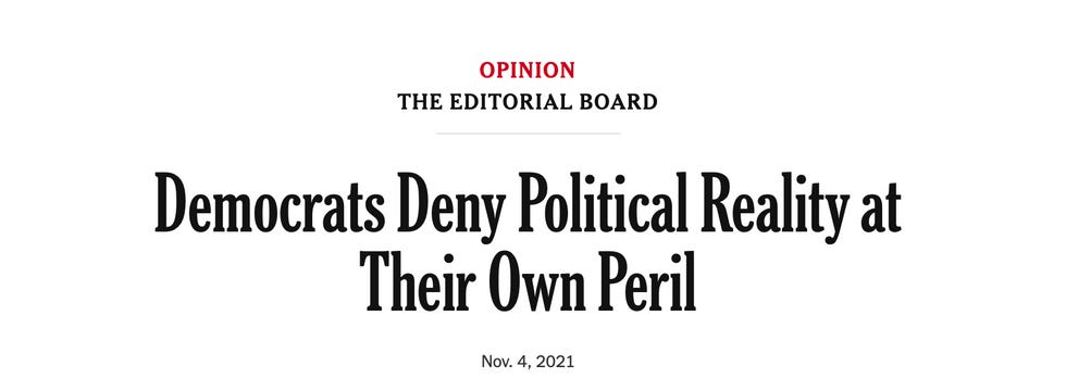 The political reality is apparently whatever the Times editorial board says it is, and what Democrats must do is "return to the moderate policies and values that fueled the blue-wave victories in 2018 and won Joe Biden the presidency in 2020."