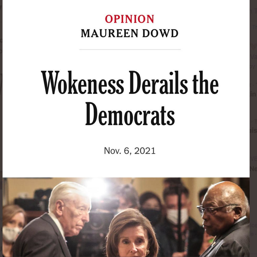 Maureen Dowd, whose retirement I'll celebrate, offered her opinion in a piece "cleverly" titled "A Woke-Up Call For Democrats." I put "cleverly" in quotes because it's not clever at all. It's trite, insulting, and slightly racist.