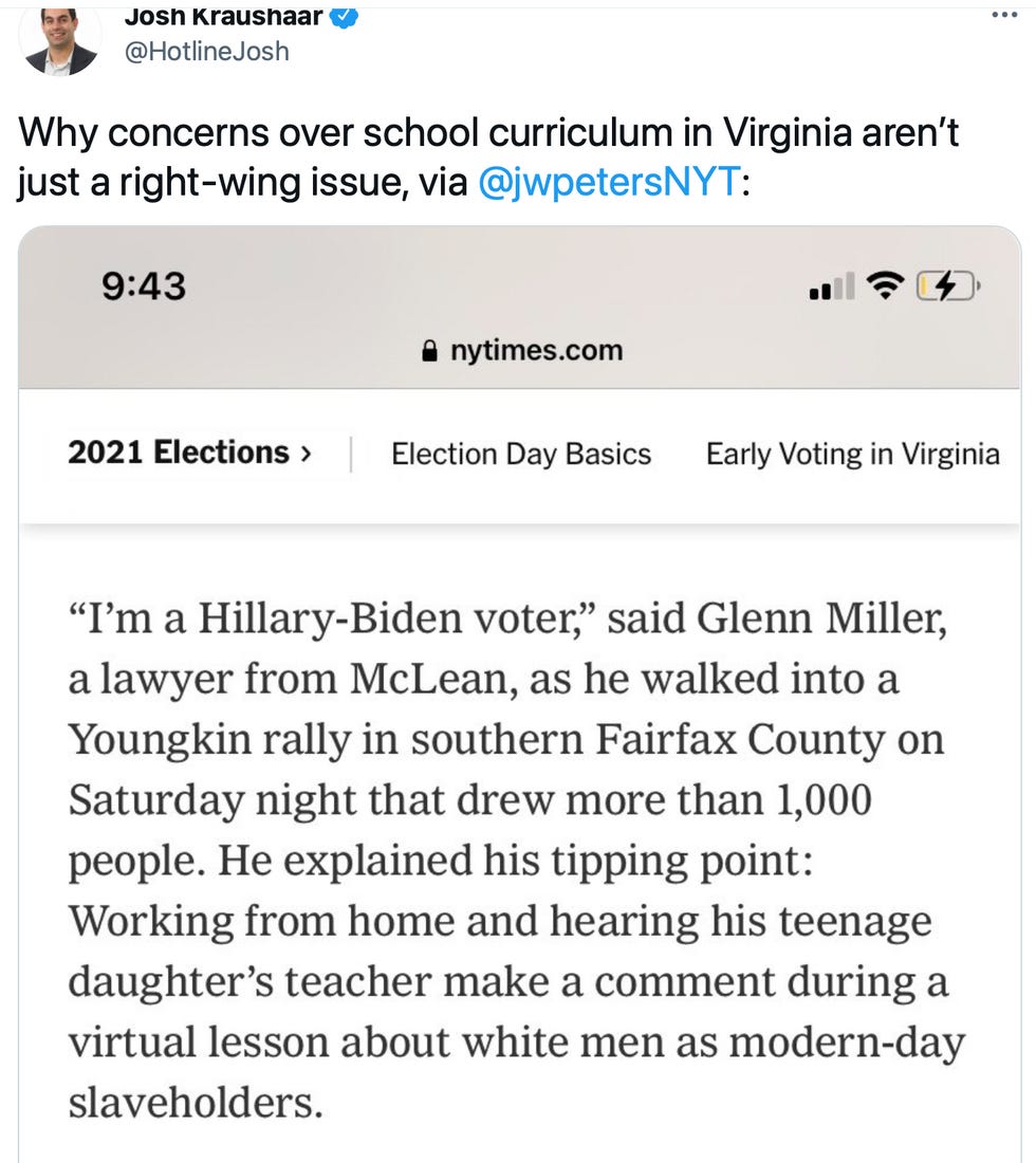 Miller was apparently such a big supporter of Hillary Clinton he feels comfortable only using her first name. Or he's a sexist creep who disrespects women. You know, Clinton had an actual platform. (She was overprepared that way) So did Joe Biden, before Joe Manchin got his hands on it. Youngkin opposes everything Clinton and Biden represent, which is why the supposed “tipping point" from reliable Democrat to fascist-tolerant Republican voter is his daughter's shocking "Kill Whitey" curriculum.