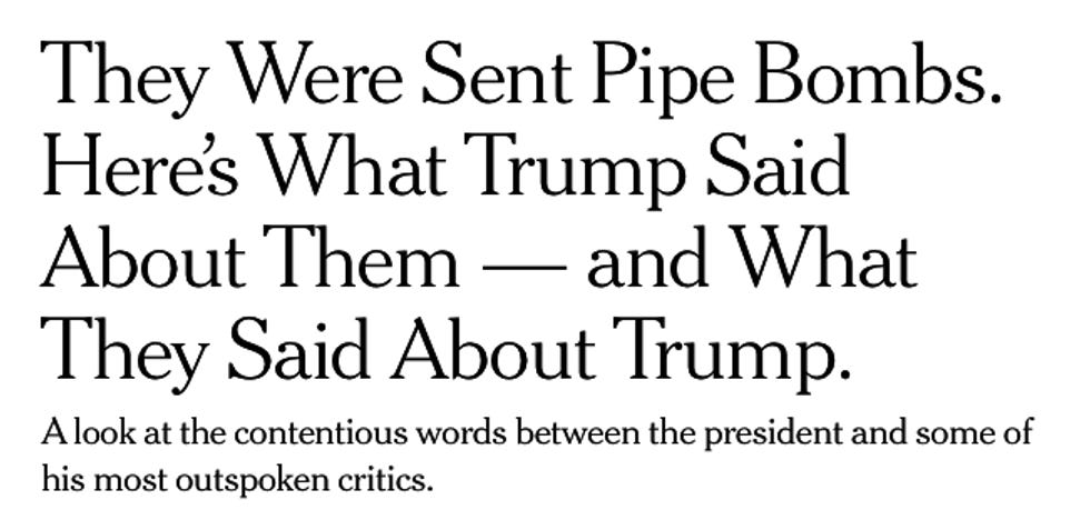 The New York Times is up to its usual antics. Friday, the paper of Bryan Adams records pulled a Chuck Schumer and equated zealous First Amendment-protected criticism of Donald Trump with the current president's unprecedentedattacks on his political opponents and any media outlet that doesn't employ Sean Hannity. This is not a new stupid thing. The media will often spin Trump's unprovoked sexist, racist attacks on "Horseface"or"Pocahontas"as a"feud" like its some comic-book clash of the titans. However, coming off a week when prominent Democrats, including two former presidents, were sent pipe bombs, it's appalling but not surprising that the house Dean Baquet torched has chosen to stay the idiotic course.
