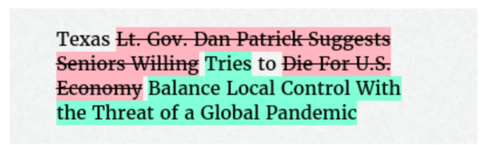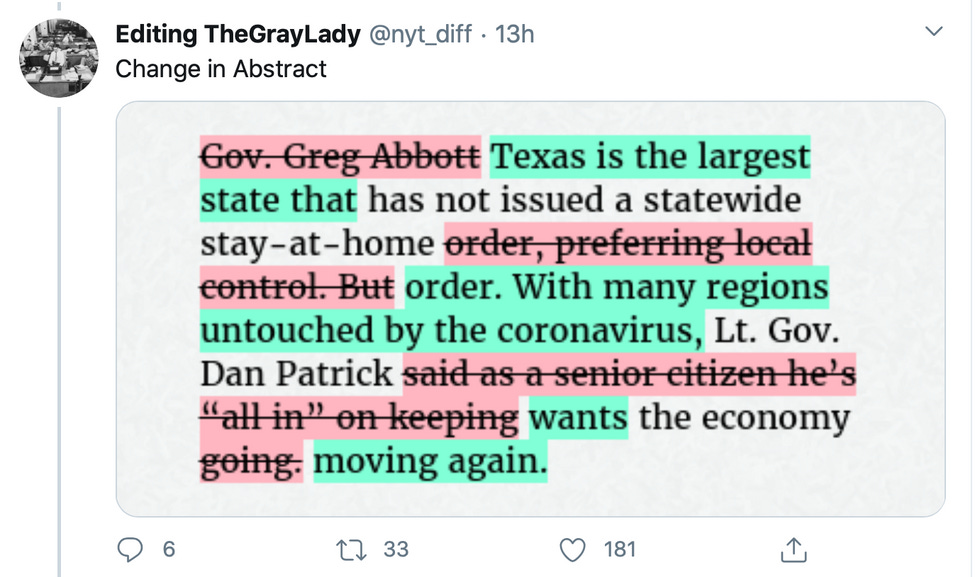 This is also a milquetoast change. Texas doesn't have a statewide “stay-at-home" order because Gov. Greg Abbott refuses to declare one. His almost criminal inaction is the story here. The edit also makes Patrick look reasonable and not as ghoulish as he actually is. Why wouldn't you want the economy moving again if “many regions are untouched by the virus"? Unfortunately, the coronavirus doesn't respect local boundaries. A region won't remain untouched forever as long as there is unrestricted movement across the state. The restrictions and orders change from county to country. There is no statewide mandate because Abbott is failing Texas.