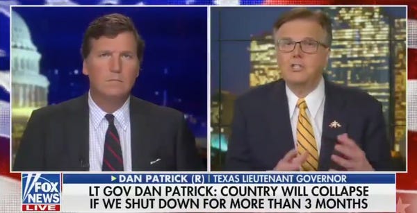 Texas Lt. Gov Dan Patrick told Tucker Carlson Monday that senior citizens such as himself would cheerfully die so that America's economy can tap dance on their graves. An elected official suggesting that we move toward a Logan's Run society is a big deal, and the New York Times originally made that clear in its headline before backpedaling like a common New York Times . The Twitter account "Editing TheGrayLady" highlighted the change.
