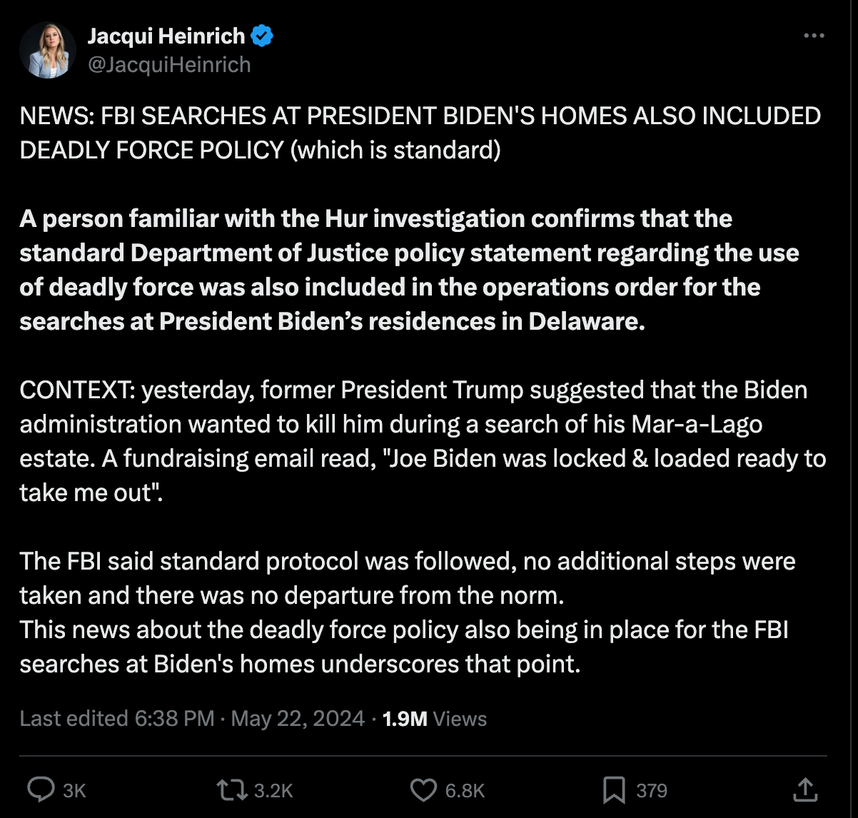 NEWS: FBI SEARCHES AT PRESIDENT BIDEN'S HOMES ALSO INCLUDED DEADLY FORCE POLICY (which is standard) A person familiar with the Hur investigation confirms that the standard Department of Justice policy statement regarding the use of deadly force was also included in the operations order for the searches at President Biden’s residences in Delaware. CONTEXT: yesterday, former President Trump suggested that the Biden administration wanted to kill him during a search of his Mar-a-Lago estate. A fundraising email read, "Joe Biden was locked & loaded ready to take me out". The FBI said standard protocol was followed, no additional steps were taken and there was no departure from the norm. This news about the deadly force policy also being in place for the FBI searches at Biden's homes underscores that point.