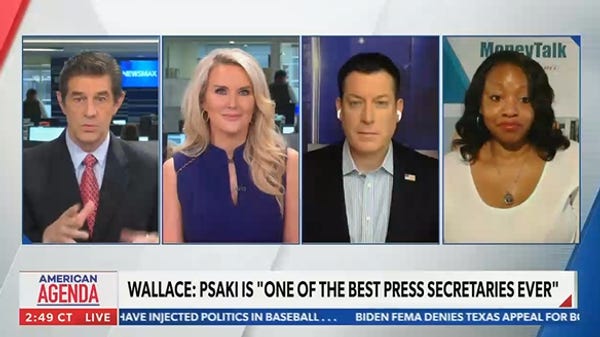 So then it was time for the panel to pour a nice cup of horse paste and have a chit-chat about Fox News being a wokey wokester that believes in critical climate theory and that Jen Psaki is a human being worthy of respect. The "Bob" anchor noted that Psaki is very mean to serious conservative journalists, and the panelist named "Melanie Collette" said Psaki has an "attitude." They were very disturbed that Fox News's Chris Wallace is such a lib who loves Jen Psaki, because of how Psaki is definitely an "irritable little troll." This made everybody on Newsmax LAUGH SO MUCH when Melanie Collette said it.