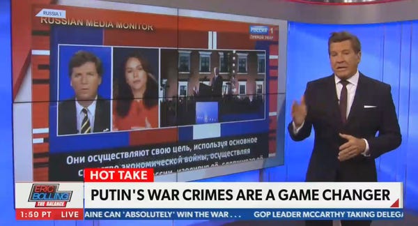 Media Matters found a recent clip from Bolling's show that ran after the Klitschko interview, after images of war crimes and genocide started to come out of places like Bucha, where Bolling personally begged Tucker to side with good. And he specifically contextualized it with the now well-known fact that Tucker is so valuable as Russian propaganda that they show him to their own people nonstop on their state-run propaganda networks.