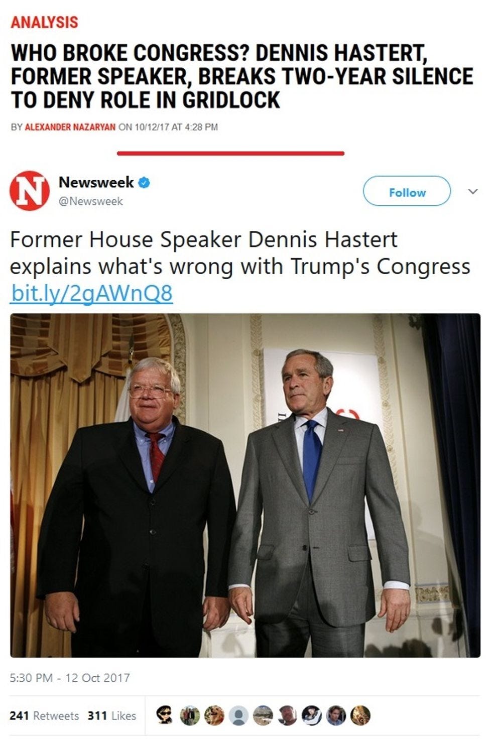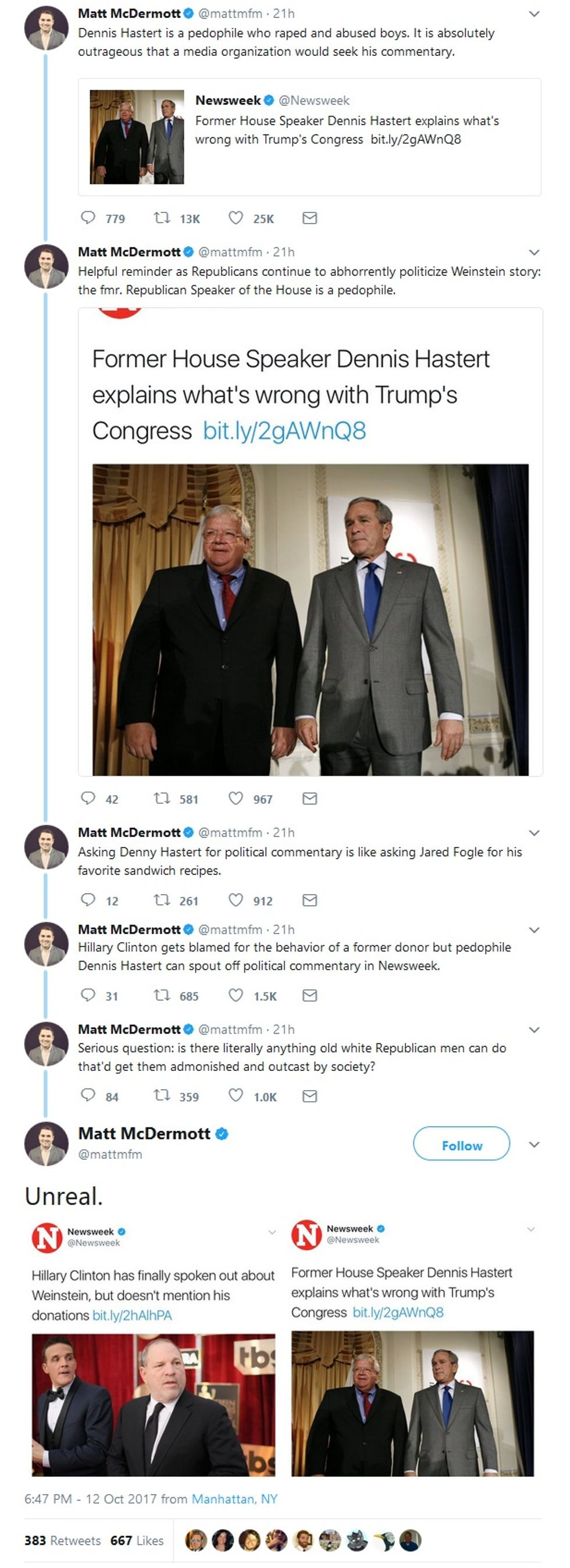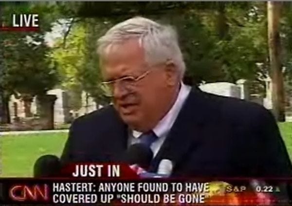 There sure is a lot of news lately! There's chaos in the White House, a bunch of infighting toddlers in Congress, and a great big Hollywood sexual harassment/rape scandal that Hillary Clinton is apparently personally responsible for. So maybe finding good sources for commentary on The Current Scene is really, really, hard -- so hard that, to really understand what's going on in the world, Newsweek had to seek out the opinion of former House Speaker Dennis Hastert, who was released from federal prison in July, after serving 13 months on a bank fraud charge. Hastert had fiddled with bank withdrawals in an attempt to cover up his hush-money payments to a former high school student he'd also fiddled with, in a sort of meta coverup.