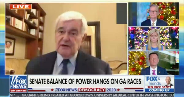 On "Fox & Friends" this morning, after praising Kelly Loeffler's robotic debate performance last night, Gingrich went with the "Well, I believe Trump won Georgia because the Democrats were clever enough to steal it from him, but people have to turn out for this next election, which will also be rigged in favor of Democrats, but the key here is for there to be more votes for Republicans than Stacey Abrams can steal for Democrats" tack.