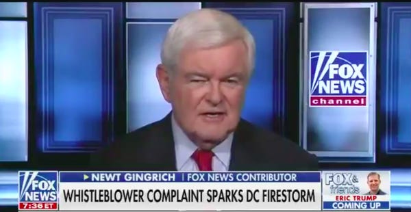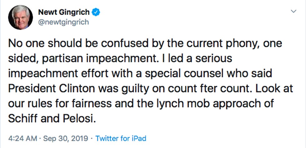 Newt Gingrich, former House speaker and serial abandoner of wives, has decided to share his unwanted thoughts on impeachment. He's a subject matter expert because he infamously attempted to remove Bill Clinton from the White House because he received blow jobs inside it. Gingrich wants us to remember how deeply satisfying an impeachment that was. America collectively smoked a cigarette afterward. It's nothing like the current Democratic-led impeachment inquiry against walking bag of felonies Donald Trump.