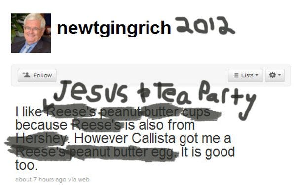 Amoral pudgesack Newt Gingrich loves only two things: divorcing his old wives after he gives them cancer, and stuffing his albino-hamster face with Easter candies to "prove" he loves his current wife, for the time being. But now his holiday gluttony is as hidden away as the records of his many cruel divorces against his dying spouses, because Newt Gingrich deleted all his old Twitter posts. It's really no surprise, because Newt Gingrich is exactly the kind of self-obsessed slob who would document his joy in slobbering all over Reese's peanut-butter Easter Eggs on a day whenrealChristians are solemnly marking the death of Jesus -- and he's exactly the kind of lying fraud who would spend hours going through his old Twitter posts to delete all the ones that don't look very "presidential candidate-ish," because they are openly racist or speak of anal sex with sea pirates as a "punishment" or, apparently, because they reveal the Newt's childish glee over some bunny-shaped sweets from the Walgreen's.