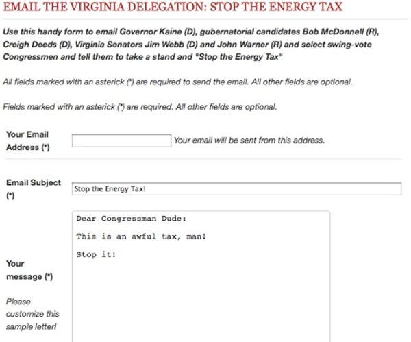 And that "Congressman Dude" is how all these fellows preferred to be addressed these days, by Twitter? This is theactual sample textfor the form email. Send it off right away, unaltered! Why mess with perfection?Thank you Virginia Energy Mole "Chris" for the tip.[ American Solutions ]