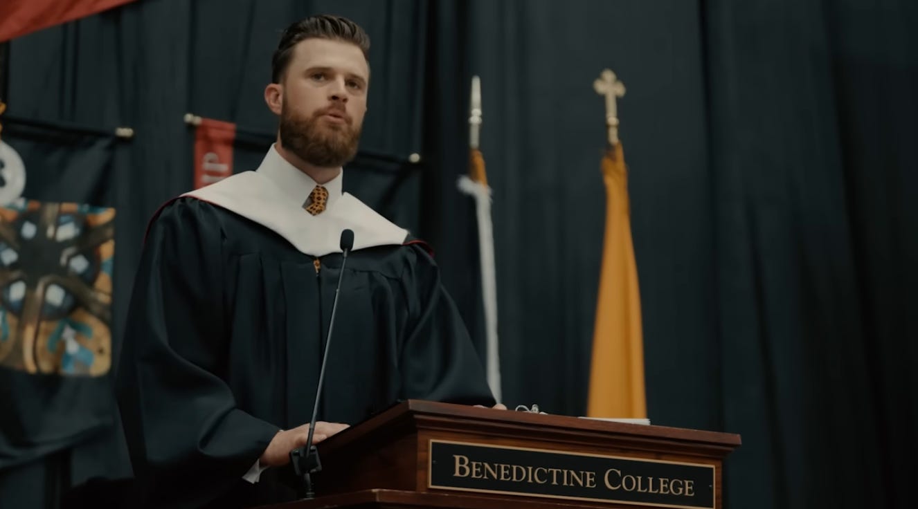 I love the absolute batshit audacity of Benedictine College: sitting in that audience were over 1,000 women who spent $33,720 USD in tuition a year to get a degree (and who outnumber the men earning degrees at that august institution, so they be a pretty important demographic for the college)....and you invite a speaker to their commencement to basically say, "thanks for the money, now burn your diploma, get a ring and hop on a bare dick."