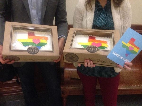We want to send these officials a clear message that Texans stand up for the freedom and the right to marry who you love. So we’re going to send several of the people in this picture a slice of love -- cakes that show that, in Texas, love is love.