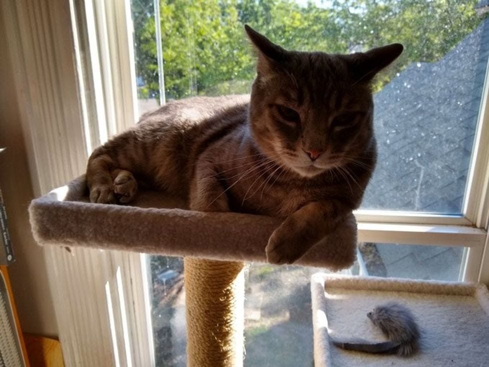 We'll close with your sun-absorbing Thornton on a quiet morning, with completely-ignored new mousie toy. Thorntoncles cares not for mousie.