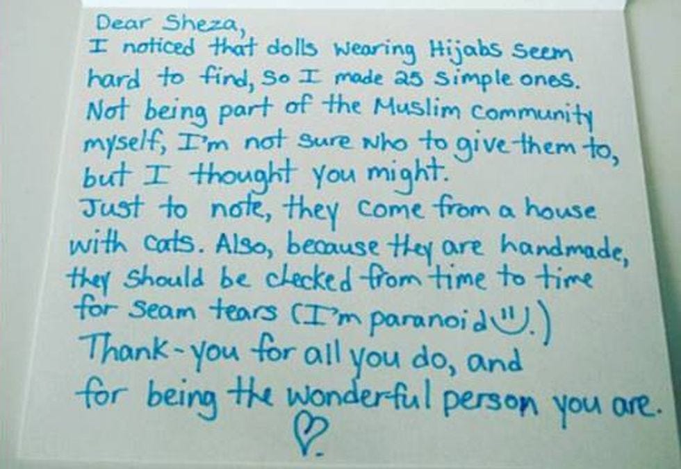 Some terribly nice-time news from Canada, which is like America only with fewer fuckheaded bigots: Last week, Sheza Hasan, a Muslim woman in Milton, Ontario, a ways west of Toronto, came home to find a box on her front step with a card on it. Inside, she found a bunch of handmade fabric dolls in bright colors and a variety of skin tones, every single one of them wearing a hijab, the hair covering favored by many Muslim women. Here is the sweet handwritten note that she posted to Facebook along with a photo of some of the dolls: