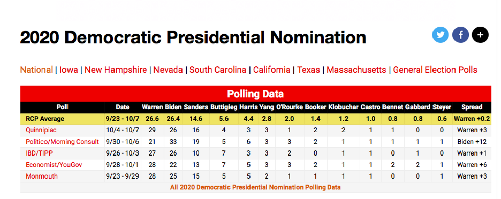 We're still a few months away from actual voting, but today marks an important shift in the Democratic primary, one that perhaps will finally bury all this tired "conventional wisdom." According to Real Clear Politics' national polling average, Warren enjoys 26.6 percent average support. Joe Biden -- Mr. Electability himself -- comes in second with an average support of 26.4 percent. Yeah, baby, Planmaster Liz is our new Democratic frontrunner!