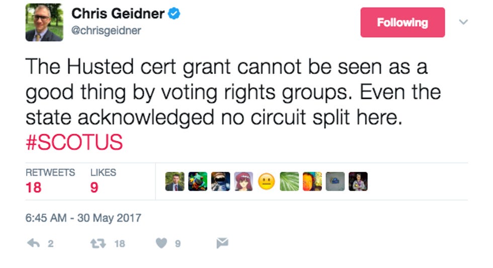 The 6th Circuit held that the VRA's No Purging for Non-Voting provision overrules this Section of HAVA, but I'm betting Roberts, Alito, Gorsuch, Thomas, and probably Kennedy have a different take. And so is Ohio's Republican Attorney General Mike DeWine , who is "pleased the Supreme Court agreed with my arguments that this decision needed review to clarify the important issue of how states like Ohio can best maintain up-to-date and accurate voter rolls." Yeah, Mike, it's all about you.