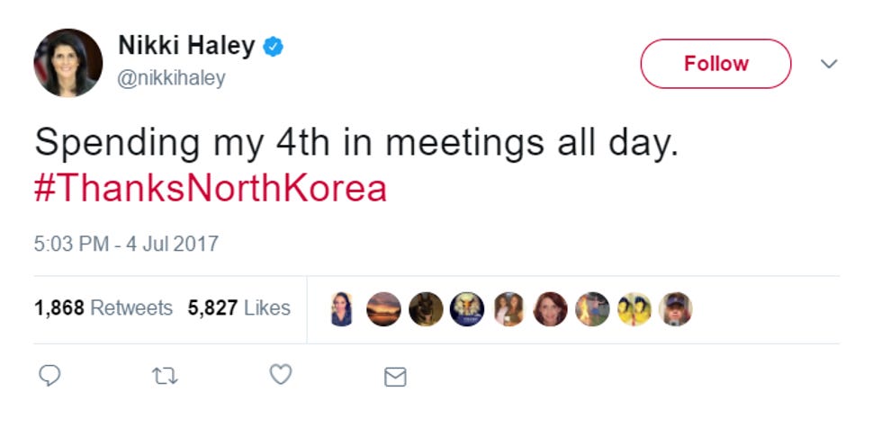 OK on one hand, we get it. Haley is an American human who, like many American humans, probably just wanted to spend the 4th of July getting drunk and eating an entire Boston butt with her face. So she was like, "UGH North Korea, you fucking loser nation from hell, you just HAD to make your little missile go boom on OUR HOLIDAY, which means I will not even finish this 12 pack of Coors Light before breakfast. FML!"