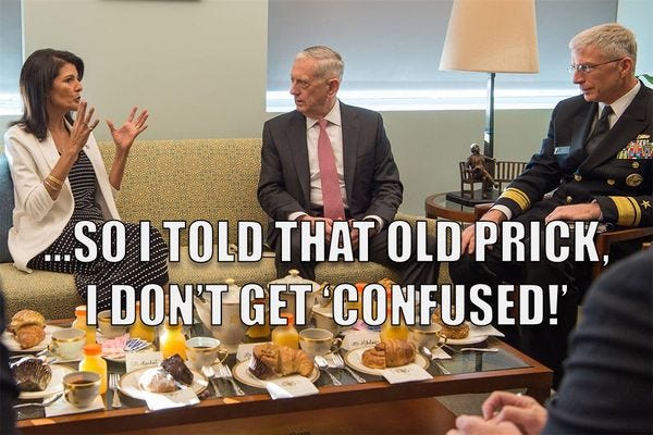 Nikki Haley was thrown under the bus by the Trump administration after announcing additional Russian sanctions at a meeting of the UN security council. Trump's economic advisory idiot Larry Kudlow called her "confused" during a press gaggle, to whichHaley clapped back in a press release stating, "I don't get confused." Kudlow backed down. She wasn't confused, they just forgot to tell her!