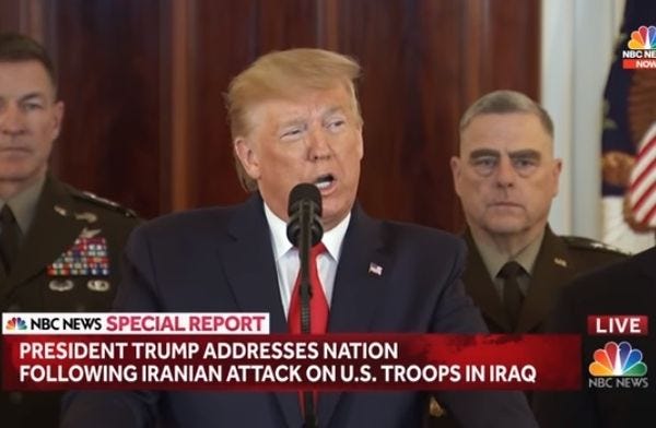 When Donald Trump did his presser the morning following Iran's missile attack on American air bases in Iraq ( we stole 'em fair and square and they belong to us) on January 8, he was very clear that both the Americans and the Iraqis at the bases were completely unscathed, HOORAY.