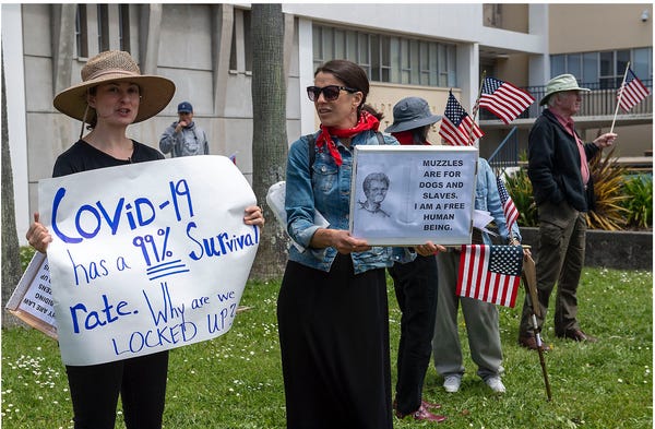 Last week, during a protest at the Humboldt County, California, courthouse over the state's stay-at-home orders, Gretha Stenger was photographed holding a sign with a black-and-white image of a young black woman wearing a muzzle. Next to the photo are the words "Muzzles are for dogs and slaves. I am a free human being."