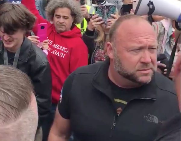 So naturally, Jones was out in full force at yesterday's rally in Austin, where more than 100 morons gathered at the Texas State Capitol in Austin for the "You Can't Close America Rally" organized by Infowars correspondent Owen Shroyer -- you know, the one that got him kicked off of Twitter last week.
