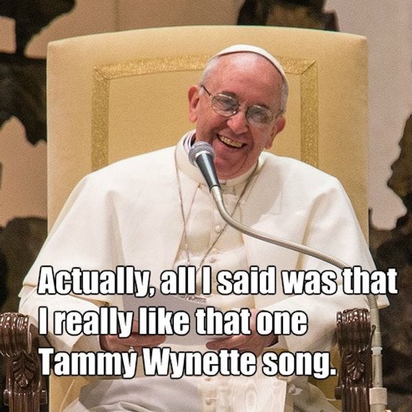 So what may have happened, according to Damian Thompson in the Telegraph , is that on Monday, Pope Francis made a phone call to Julio Sabetta, a gentleman in Argentina, to answer a letter sent by the man's wife, Jacquelina Lisbona, who had written to ask New Pope if she could take communion again -- the couple has been in a civil marriage for 19 years, and had two daughters together, but Mr. Sabetta had gotten divorced before they were married (and just to throw in some added confusion, the earliest reports said that it was Ms. Lisbona who'd been divorced). Now, this is where dogma comes in -- Catholics Do Not Get Divorced. OK, they totally do, but they don't get remarried. OK, they do, but if they get remarried, they can't do it in the Church, and they can't take communion after, because it gives God a sad because in the eyes of the Church, they are Living In Sin. Supposedly, Pope Francis told Sabetta, "Ya sure, you betcha, tell her to go for it" or words to that effect, which would be pretty giant news if it actually happened, because Catholics can only get married just the once (unless they get an annulment, which is rare-ish). If the story is true and the Pope actually let a bit of changing doctrine slip out, it would be a big effin' deal for Catholics, possibly bigger than Obamacare even.