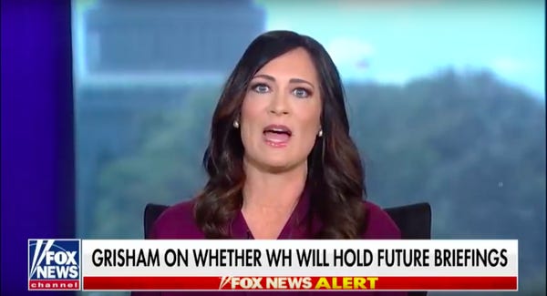 Grisham does dial in for interviews on Fox News, which requires her to at least wear a dressy top over her jeans and flip-flops. Media Matters pointed out it's a little strange for the press secretary to only turn up on state media. But it's the only network Trump watches and Grisham wants full credit for her 20-hour work weeks.