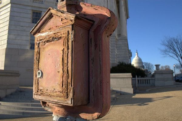 The war on terror is over, and America won! Here is proof, in the form of a rusty emergency box directly outside the Longworth House Office Building on Capitol Hill. If any homeland security threats remained, this box would surely be unblemished, maybe even operational!